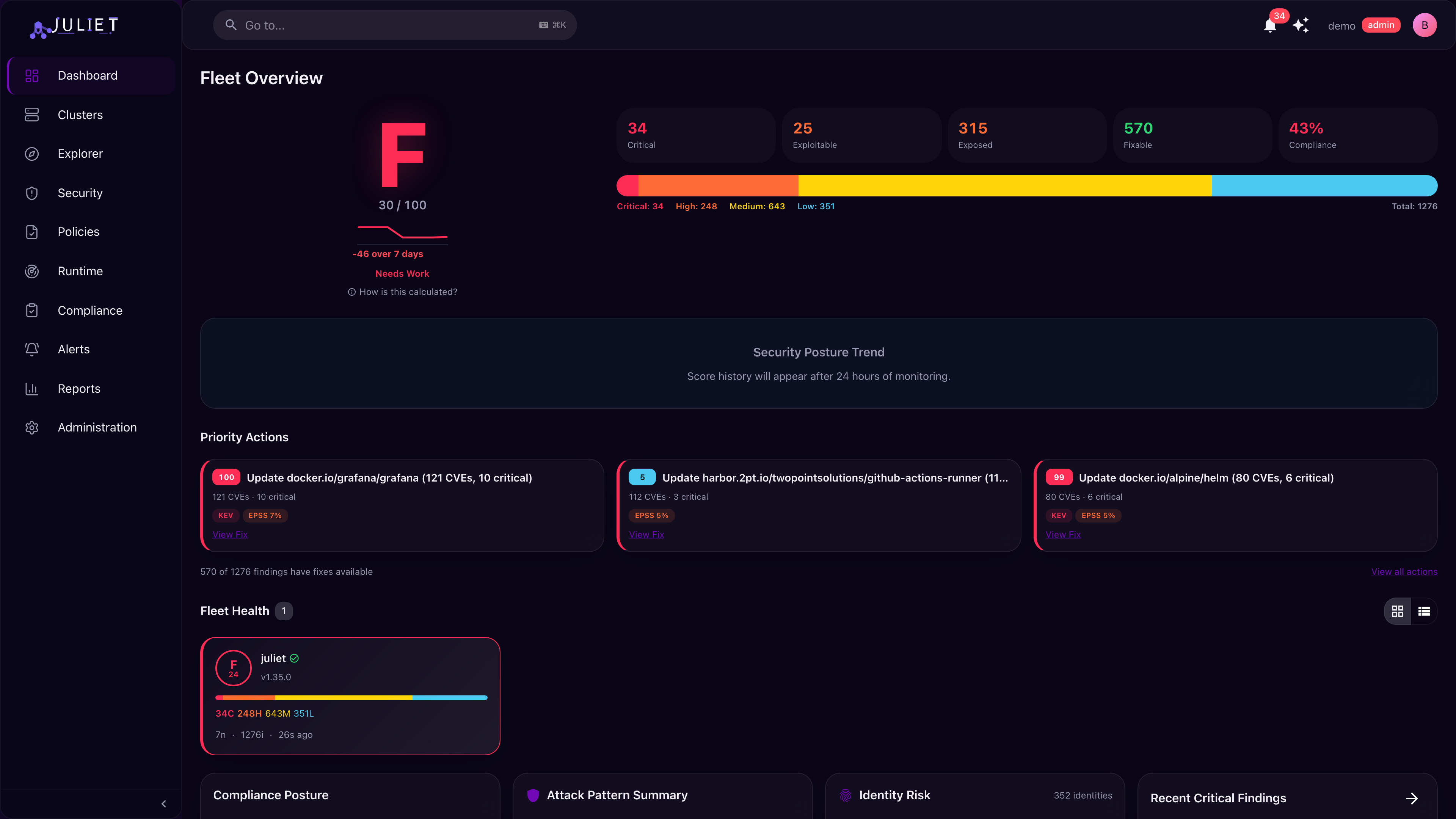 Deploy Juliet in your cluster and see your security posture in minutes. One Helm chart, full visibility. No credit card required.